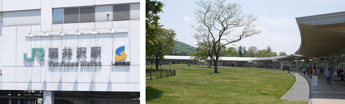 しかも、改札を抜けると駅の目の前には、巨大な軽井沢アウトレットモールがド~ン!(写真右)駅から直結していて、めちゃめちゃ便利っすね(☆ー)