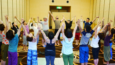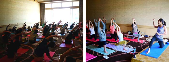 本会場では、軽井沢プリンスホテルの大広間を4スペース貸し切り、各スペースで様々なヨガクラスが行われていました。どのクラスも人がたくさん入っていて、びっくり!(☆-;)