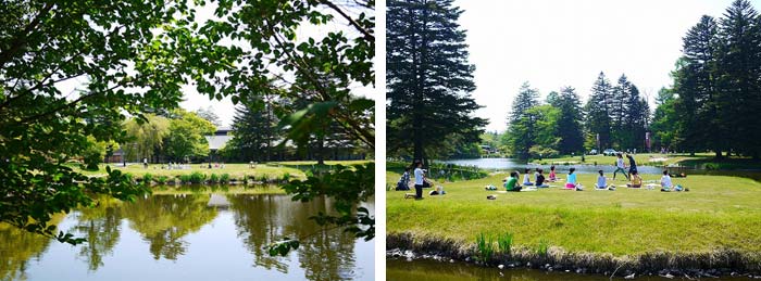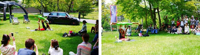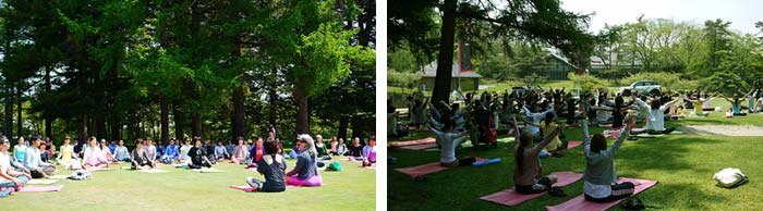 なんと、そこには眩しいくらい緑な芝生の上で、青空ヨガが行われているではありませんか!