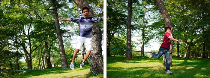 気付いたら、いつの間にかノブも合流してて、なぜか、爽やかな軽井沢の森の中で、暑苦しい関西人がスラックラインに挑戦する事に!? (笑)
