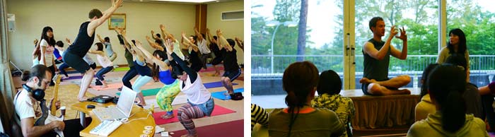 さらに会場では、日本のヨガシーンでお馴染なパトリック先生(左)や、ヨガミュージシャンとして来日し、ヨガクラスの中で生演奏をしていた、Raraさん(右)も、凄く陽気で気さくな先生達が、生徒さん達と積極的にコミュニケーションをとっておられて、先生と生徒の距離が凄く近く感じました♪