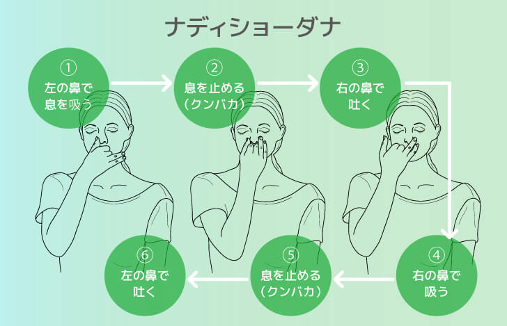 特にオススメなのが、言わずと知れたヨガの呼吸法の基本中の基本、ナディショーダナ(片鼻呼吸法)。