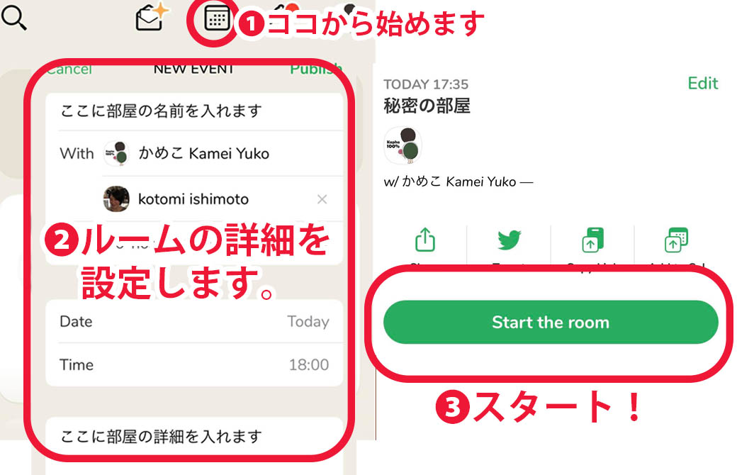 誰とルームを開催するのか?いつ?どんな内容を話すのか?を予め設定します。