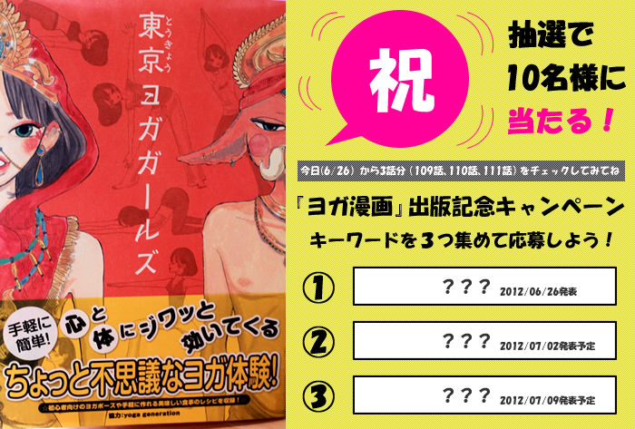 この度の応募にあたっては、本日掲載のヨガ漫画109話を始めとする今後3話の最後のコマに含まれたキーワードを添えてご応募いただきたい!!