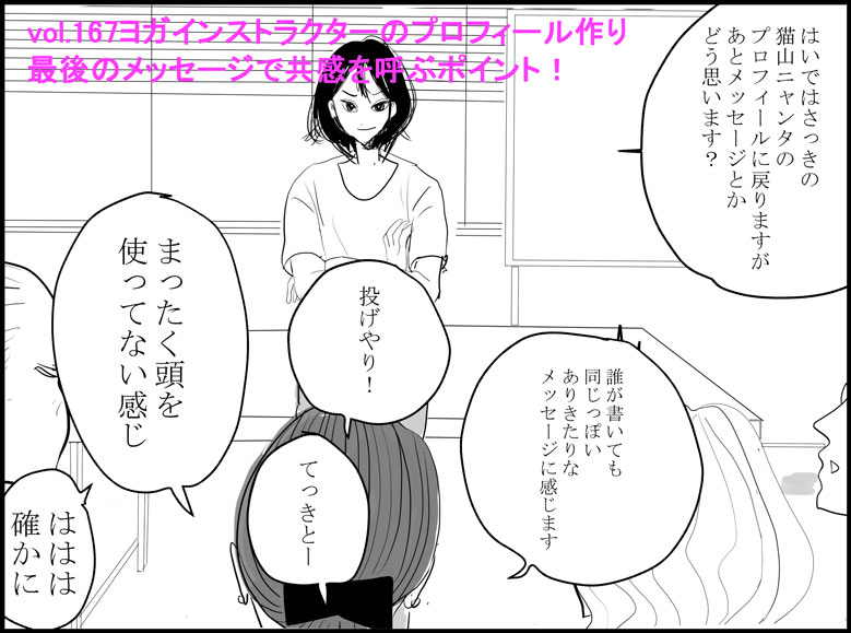 ヨガ漫画167話 | 『ヨガインストラクターのプロフィール作り 最後のメ メディアを追加ッセージで共感を呼ぶポイント!』